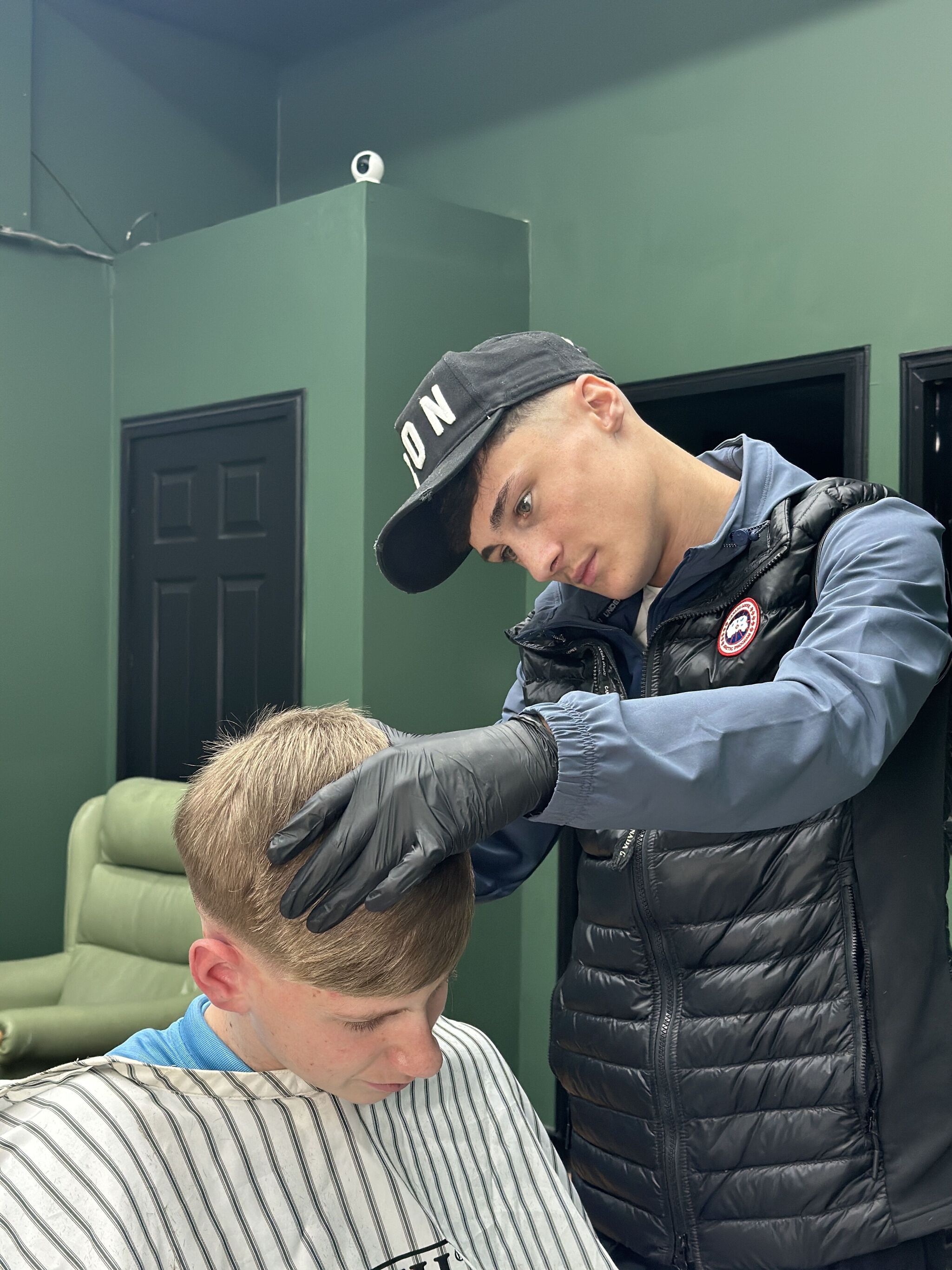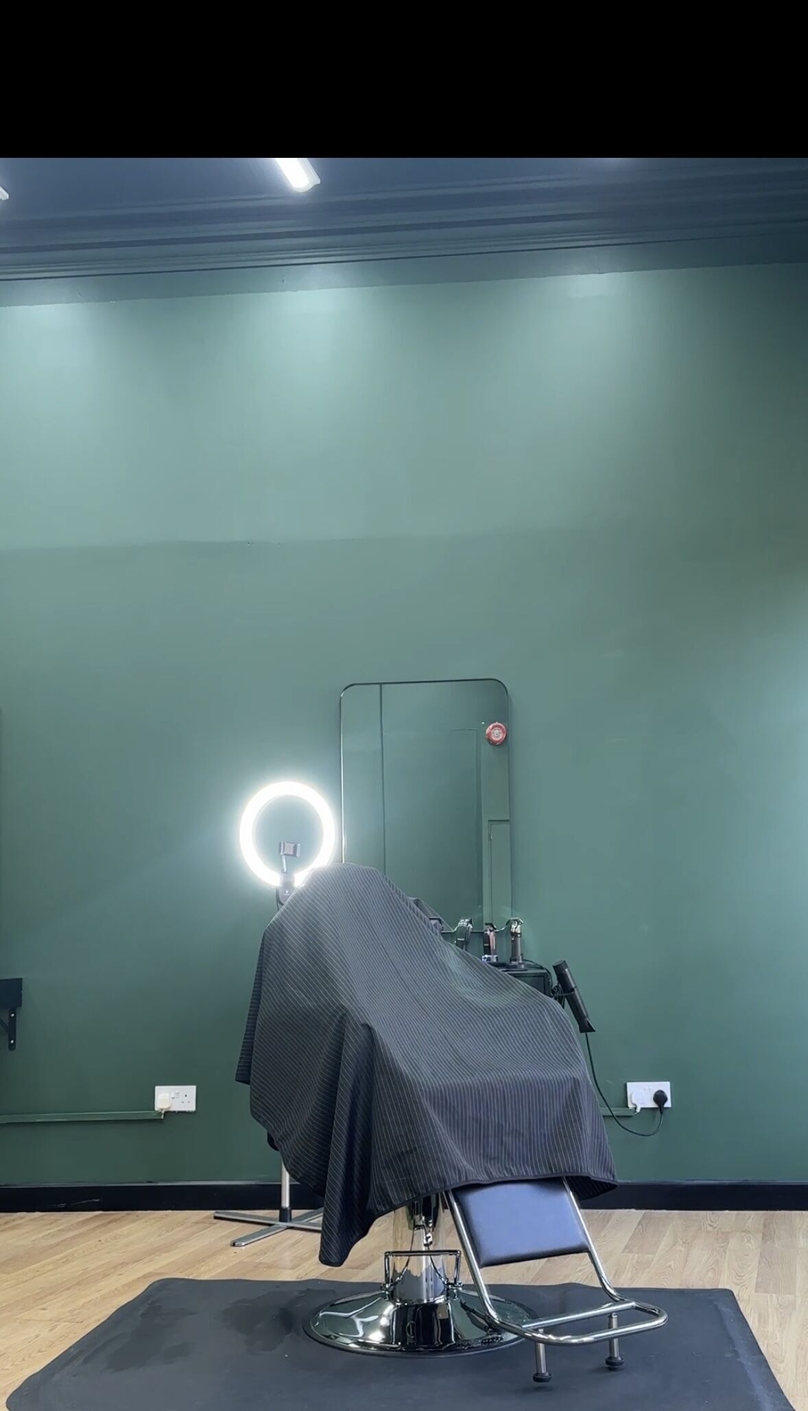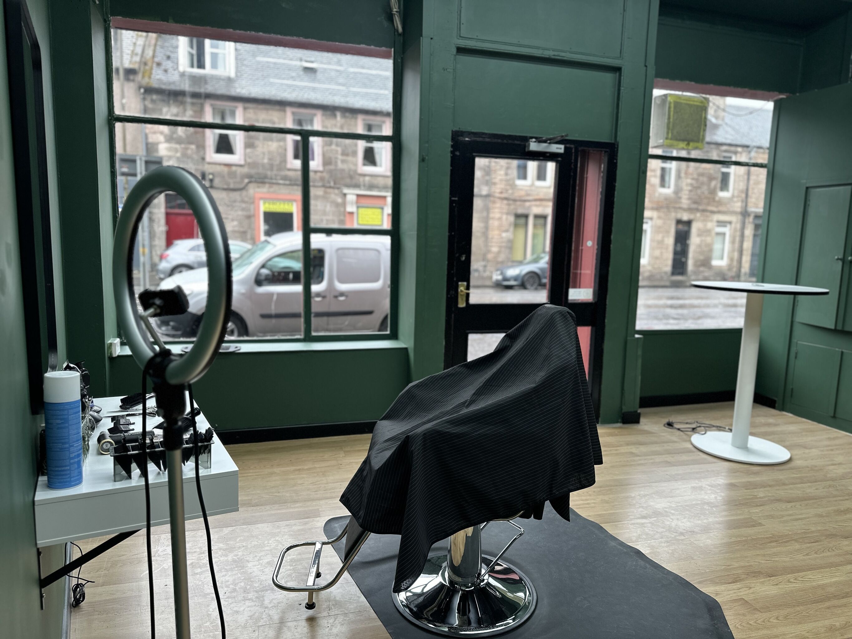Modern barbershop interior in Musselburgh — RYZN Barbers & Grooming’s minimalist design with olive grove walls and professional barber stations.
